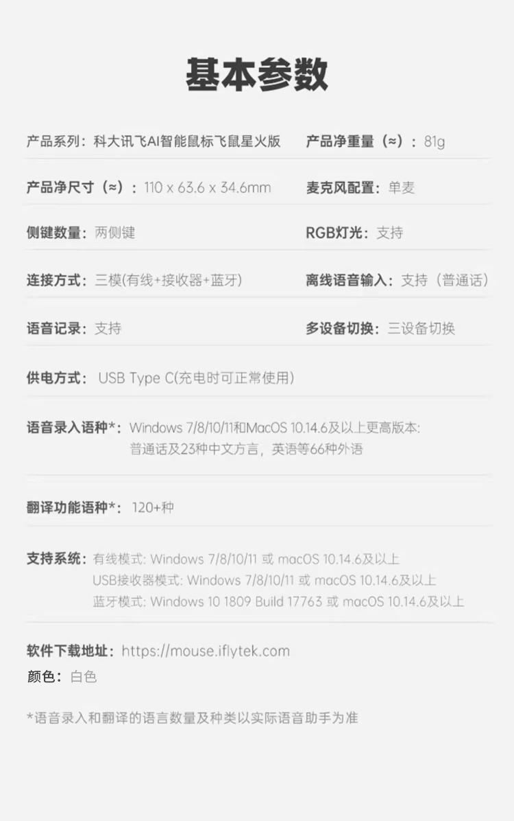 科大讯飞 智能办公鼠标 飞鼠星火版 白色